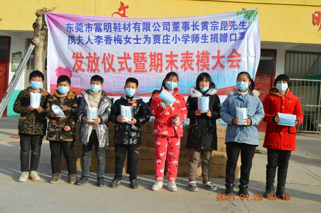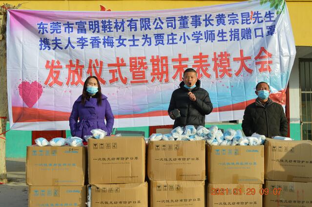 廣東省東莞市富明鞋材有限公司董事長黃宗昆先生及夫人李香梅女士原籍太康縣馬頭鎮(zhèn)薛廟村,他們得知寒假將至,正值師生、家長返鄉(xiāng)團(tuán)聚、走親訪友高峰時節(jié),當(dāng)前疫情防控面臨境外疫情持續(xù)爆發(fā)流行、國內(nèi)散發(fā)病例頻發(fā)的新情況、新挑戰(zhàn)。為了確保賈莊小學(xué)300多名師生生命安全和身心健康,以及他們近期疫情防控對口罩的需求,進(jìn)一步增強(qiáng)師生的防控意識,夫妻二人決定為該校捐贈3萬只一次性醫(yī)用口罩,以實際行動助力該校疫情防控工作。
