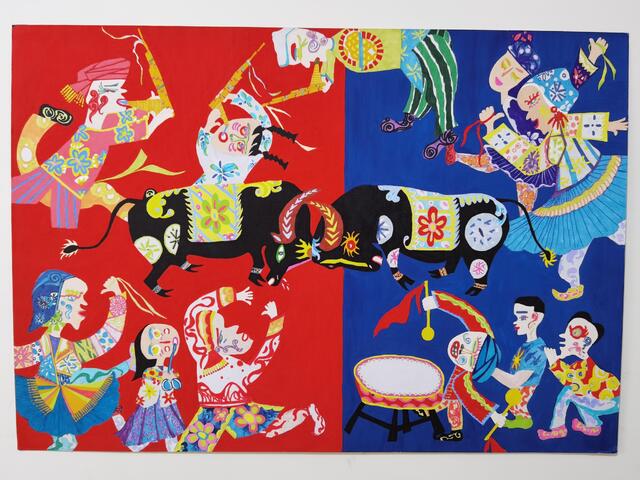 2020年4月,錢玉燕無意中看到“決勝全面小康”第二屆全國農(nóng)民畫展覽征稿啟事,對(duì)農(nóng)村生活非常熟悉的她決定一試。她立足于周口平原農(nóng)區(qū)的特色,深深領(lǐng)悟周口幾千年來的農(nóng)耕文化,對(duì)參賽作品進(jìn)行了認(rèn)真、系統(tǒng)地構(gòu)思,最終決定以歡慶豐收的斗牛活動(dòng)為題材,把農(nóng)耕文化的深遠(yuǎn)、厚重與豐富的藝術(shù)表現(xiàn)手法相融合。她采用普通的繪畫卡紙,運(yùn)用多種繪畫顏料,充分借鑒漢畫藝術(shù),吸收中原地區(qū)的剪紙文化、西方藝術(shù)大師畢加索立體畫派的藝術(shù)風(fēng)格和古埃及畫的靈感,以艷麗的紅、藍(lán)為主背景,采取夸張的表現(xiàn)手法,把斗牛的場(chǎng)景表現(xiàn)得淋漓盡致。作品創(chuàng)作發(fā)揮了豐富的想象力,人物動(dòng)物造型借鑒中國民間藝術(shù)剪紙的方式表現(xiàn),以大膽、夸張、強(qiáng)烈的色彩搭配,把無限深廣的空間“壓扁”到一個(gè)平面上。