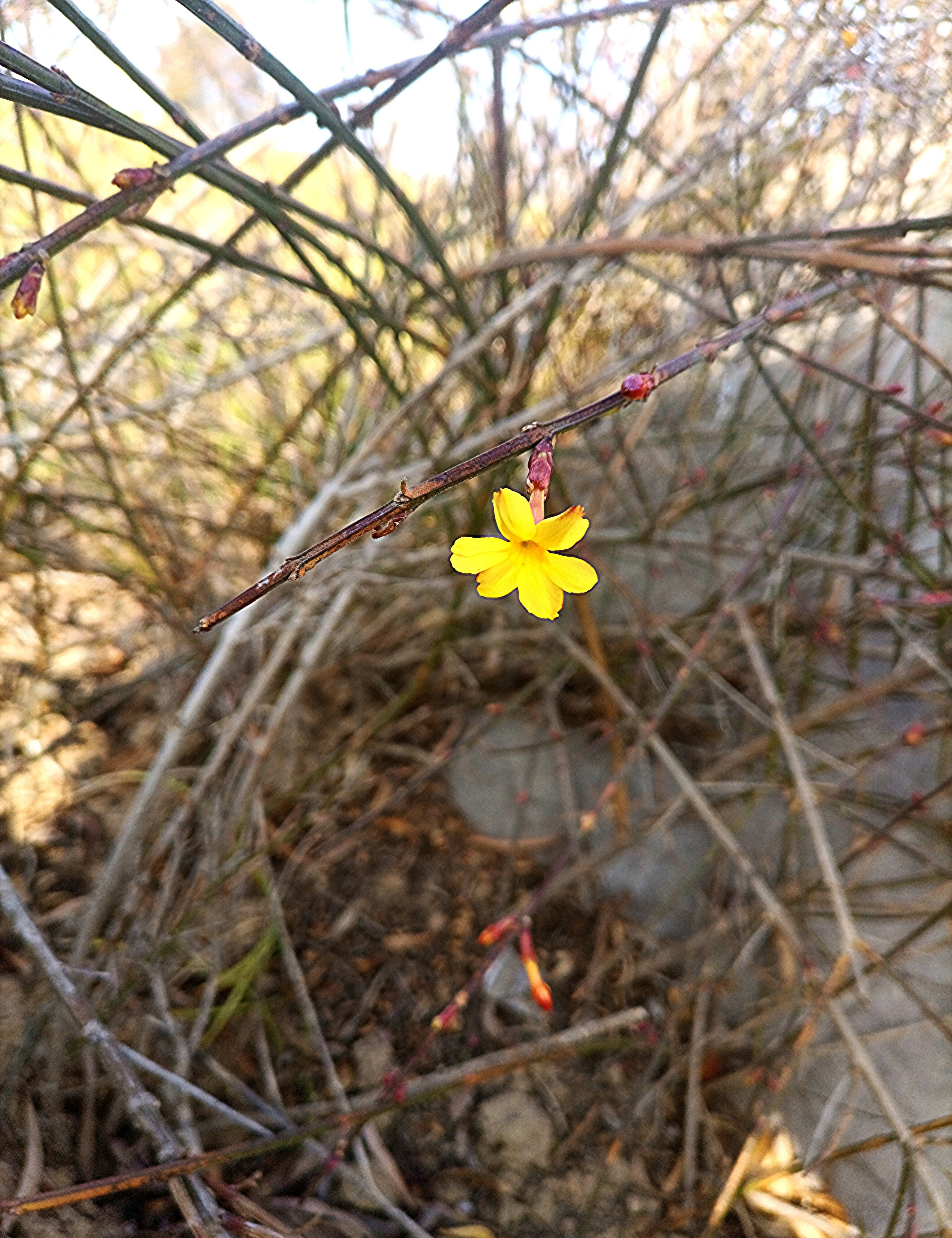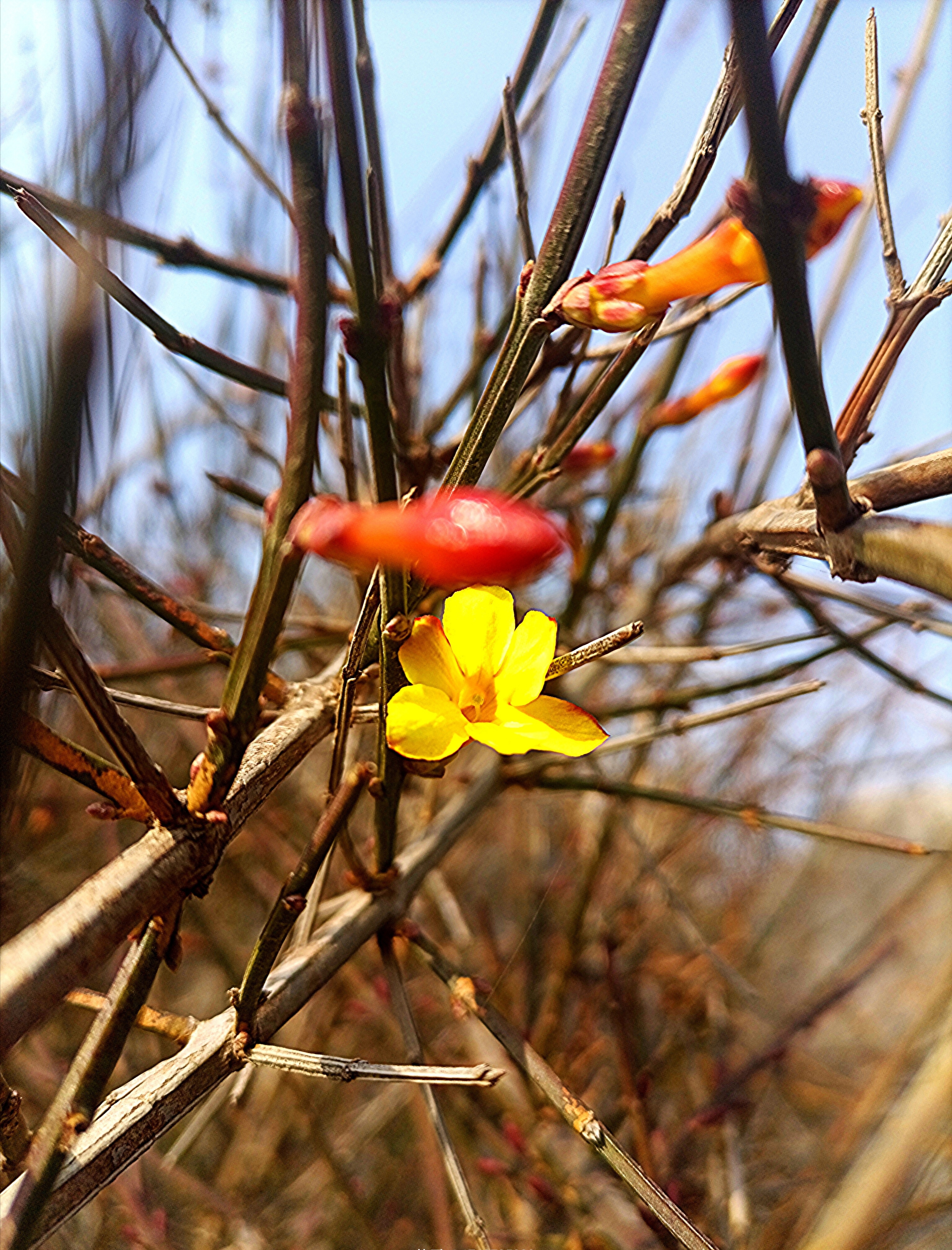 2月3日,是立春時節(jié)。接連幾日,我市天氣晴朗,氣溫漸暖,周口公園的迎春花枝條已經(jīng)掛滿了花蕾,偶有幾朵“性急”的花兒已經(jīng)綻放,迫不及待地迎接春天的到來,嫩黃的花瓣在陽光的照射下,閃耀出金子般的光芒,令人見之心喜。