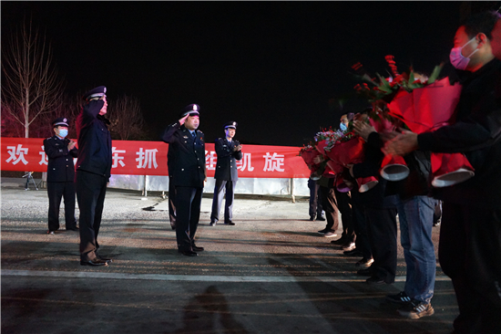 英雄凱旋,鮮花致敬。2月6日夜晚11時(shí)許,寧洛高速項(xiàng)城北收費(fèi)站警燈閃爍、隊(duì)列整齊,項(xiàng)城市公安局在這里隆重舉行儀式,熱烈歡迎 “1.8”專案組民警勝利歸來。副市長(zhǎng)、公安局長(zhǎng)萬東偉,局黨委副書記、副局長(zhǎng)陳重,局黨委委員、政辦室主任衛(wèi)偉,局黨委委員袁啟峰等領(lǐng)導(dǎo)出席儀式,部分民警代表參加了儀式。萬東偉同志代表局黨委對(duì)此案的成功偵破表示熱烈祝賀,真誠(chéng)感謝專案組民警的辛勤付出,并向大家致以崇高的敬意。