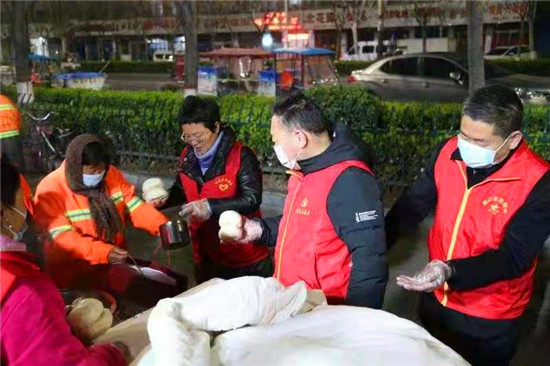 當日早上5時,在愛心粥屋里,示范區(qū)分局的志愿者們穿著紅馬甲,戴上口罩,立即進入忙碌狀態(tài),大家既分工明確又相互配合,現(xiàn)場井然有序。他們?yōu)榄h(huán)衛(wèi)工人盛飯端菜,拿雞蛋饅頭,動作迅速,熱情周到,有條不紊,個個忙得不亦樂乎。在這個清冷的早晨,因為有了熱氣騰騰的飯菜和志愿者忙碌的身影,環(huán)衛(wèi)工人開心地笑容,感受到濃濃暖意。