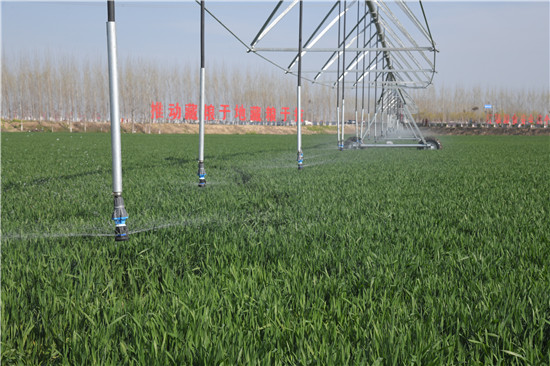 3月28日,商水縣天華合作社調(diào)試中的自走式節(jié)水灌溉設(shè)備正在噴水。