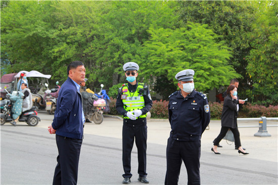 活動計劃是上午9時開始,朱衛(wèi)兵帶領(lǐng)鐵騎隊從早上7點就來到校園周邊布置崗哨,對鄲城一高周邊的校園路、公園東路、一高北路、一高東路、公園北路進行車輛引導(dǎo),共出動警力46人,警車一部,警用摩托車21輛,形成了各路口有崗、50米一哨。一方面確保車輛有序停放,另一方面守護師生和家長安全。