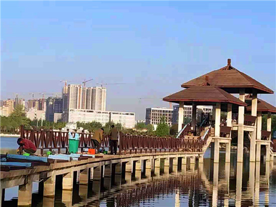 近日,位于文昌大道的周口公園啟動了對水上棧道的維修。周口公園的水上棧道和亭榭是一道美麗的風景,成為人們游園打卡之地,然而因建造時用的是木材,歷經風雨,朽壞嚴重,存在安全隱患,周口公園方面于去年將之封閉。記者在現(xiàn)場看到,工人已經將木質扶欄、道上木板拆除,正在安裝鐵護欄。鐵護欄油漆成棕褐色,依然保持原棧道的風格和色調。②7