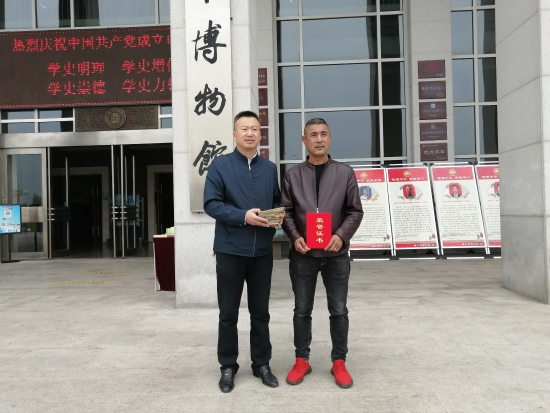 4月25日,周口市博物館收到周口市文昌辦事處李莊社區(qū)村委委員趙團(tuán)結(jié)向捐贈的兩件唐代黃釉瓷碗,該文物對周口漕運史具有研究價值。周建山館長向趙團(tuán)結(jié)頒發(fā)收藏證書,并感謝他對周口考古工作的支持。