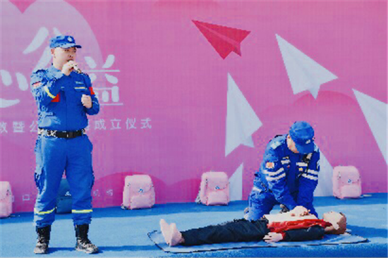 活動現(xiàn)場,藍天救援隊隊長孟坤以多年救援經(jīng)驗,與隊員們互相配合,演示如何正確穿戴救生衣、如何正確實施心肺復蘇術(shù)等,還生動演繹了當學生遇到有人落水等突發(fā)情況,如何在保證自己不受傷害的情況下實施救援。