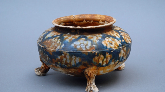 周口市博物館陳列著一件唐代藍(lán)釉三彩爐,它整體施藍(lán)釉,白黃交錯(cuò),挺著圓圓的肚子在唐三彩隊(duì)伍里高冷“上線”、“C位”出道。