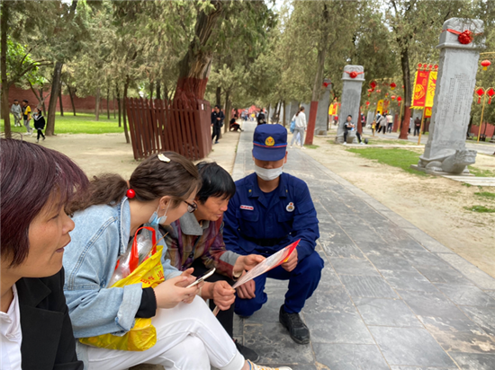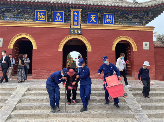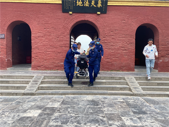 統(tǒng)天殿前一名老人步履蹣跚,正在殿前廣場巡檢的前置執(zhí)勤點消防人員迅速向前,接過手提袋,小心翼翼地攙扶老人走上臺階跨過門檻……而這,僅僅是“五一”假期太昊陵景區(qū)消防人員緊急幫助游客的一個場景。在各景區(qū),隨處可見“火焰藍”的身影,他們堅守一線執(zhí)勤崗位,疏導人流、定點警戒,想群眾之所想、急群眾之所急,舍小家為大家。