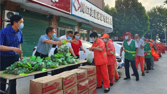 • “真是太感謝了,志愿者們?yōu)槲覀儼聂兆?,吃到嘴里,暖在心里。一直以來,黨和政府對我們保潔員都很關(guān)心”西華縣龍池頭村保潔員宋海軍笑著說。