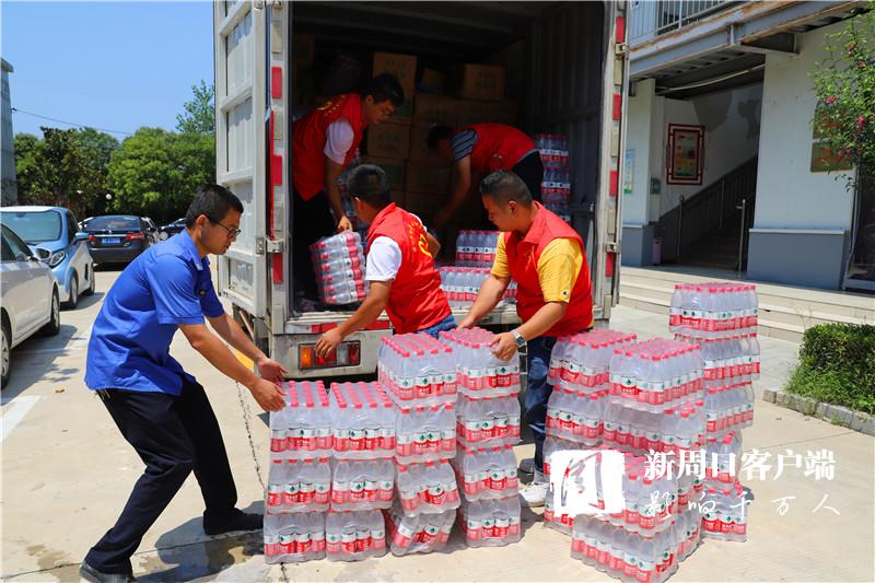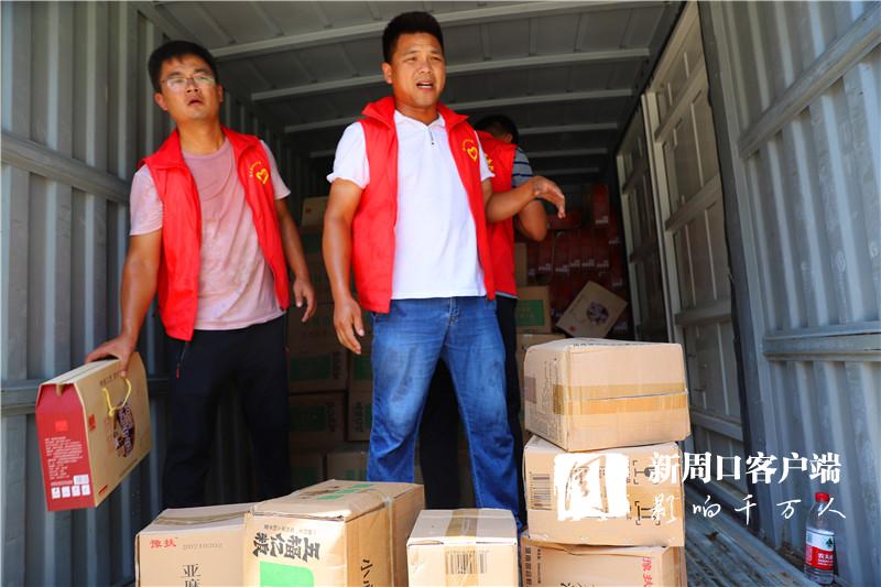 當(dāng)天中午,掛著印有“昨天大家助我脫貧,今天我為救災(zāi)出力!”條幅的防汛救災(zāi)物資運(yùn)輸車抵達(dá)周口港區(qū)?!耙皇乔皟商旆烙_(tái)風(fēng)‘煙花’,我們?cè)缇蛠砹?。”隆古村黨支部書記段長春一下車就連忙慰問眾人。一同前往的還有6位年輕力壯的志愿者,他們不辭勞苦,和港區(qū)消防、城管人員一起頂著烈日,用了半個(gè)多小時(shí)將滿車物資搬運(yùn)到位。