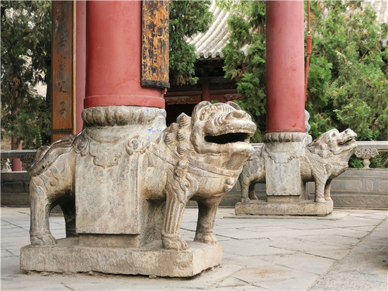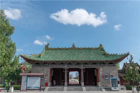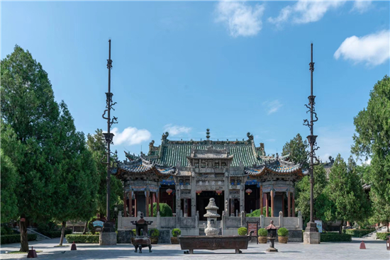 整個(gè)古建筑群為仿宮殿式,山門(mén)、鐵旗桿、石牌坊、碑亭、饗殿、大殿、河伯殿、炎帝殿、戲樓、拜殿、春秋閣由南向北,建于中軸線(xiàn)上,藥王殿、灶君殿和東廊房,財(cái)神殿、酒仙殿及西廊房在前院左右,東西看樓、東西配殿建在中院兩側(cè),老君殿、馬王殿、瘟神殿為東偏房,客房僧舍位于西院。是全國(guó)重點(diǎn)文物保護(hù)單位,國(guó)家AAAA級(jí)旅游景區(qū),國(guó)家三級(jí)博物館。