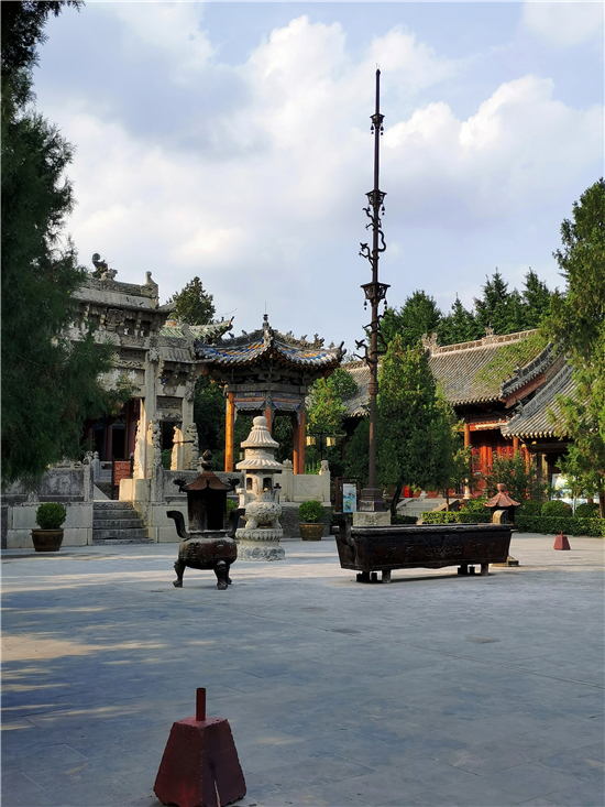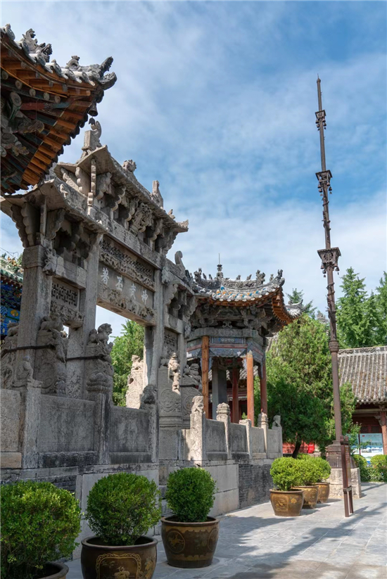 過(guò)山門(mén),突現(xiàn)在眼前的是一對(duì)鐵旗桿。鐵旗桿高22米、重3萬(wàn)余斤,且桿身鑄有銘文圖案、山水花卉、龍鳳鳥(niǎo)獸。