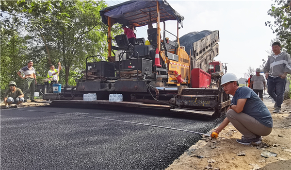 路面鋪油作業(yè)從淮陽區(qū)葛店鄉(xiāng)與鄲城縣李樓鄉(xiāng)交界處開始,一臺攤鋪機(jī)鋪設(shè)寬度為7米,壓實厚度為5厘米,以平均每分鐘5米的速度前行,數(shù)輛運(yùn)料車輪流供料給攤鋪機(jī)。攤鋪機(jī)過后,兩臺壓路機(jī)交替運(yùn)行,立即把路面壓實;兩臺灑水車配合作業(yè),路面一次成型,寬闊而平坦。