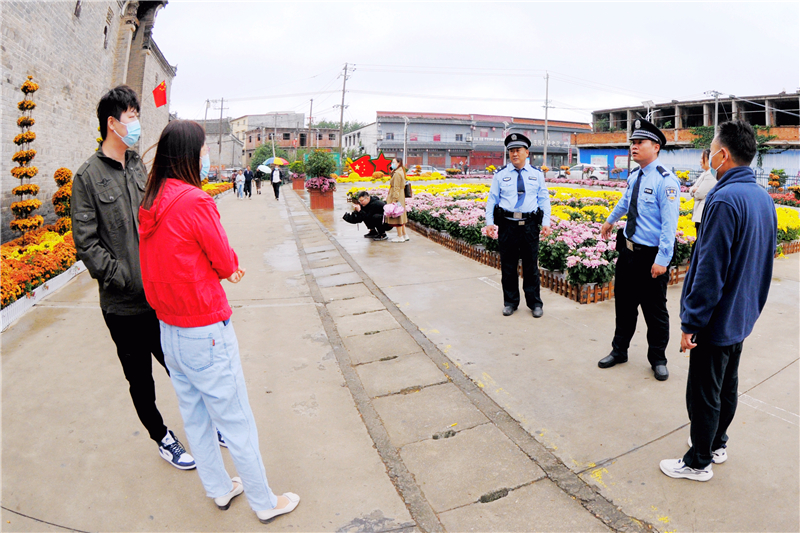 國(guó)慶七天長(zhǎng)假,商水縣公安局在致力文旅創(chuàng)意的葉氏莊園、水韻章華等景區(qū)內(nèi)加強(qiáng)巡邏執(zhí)勤,維護(hù)景區(qū)的安全穩(wěn)定,為來(lái)自全國(guó)各地的游客提供服務(wù)。圖為10月7日,商水縣公安局鄧城派出所民警在有“中原小故宮”之稱(chēng)的葉氏莊園景區(qū)菊展現(xiàn)場(chǎng)巡邏執(zhí)勤、服務(wù)游客。