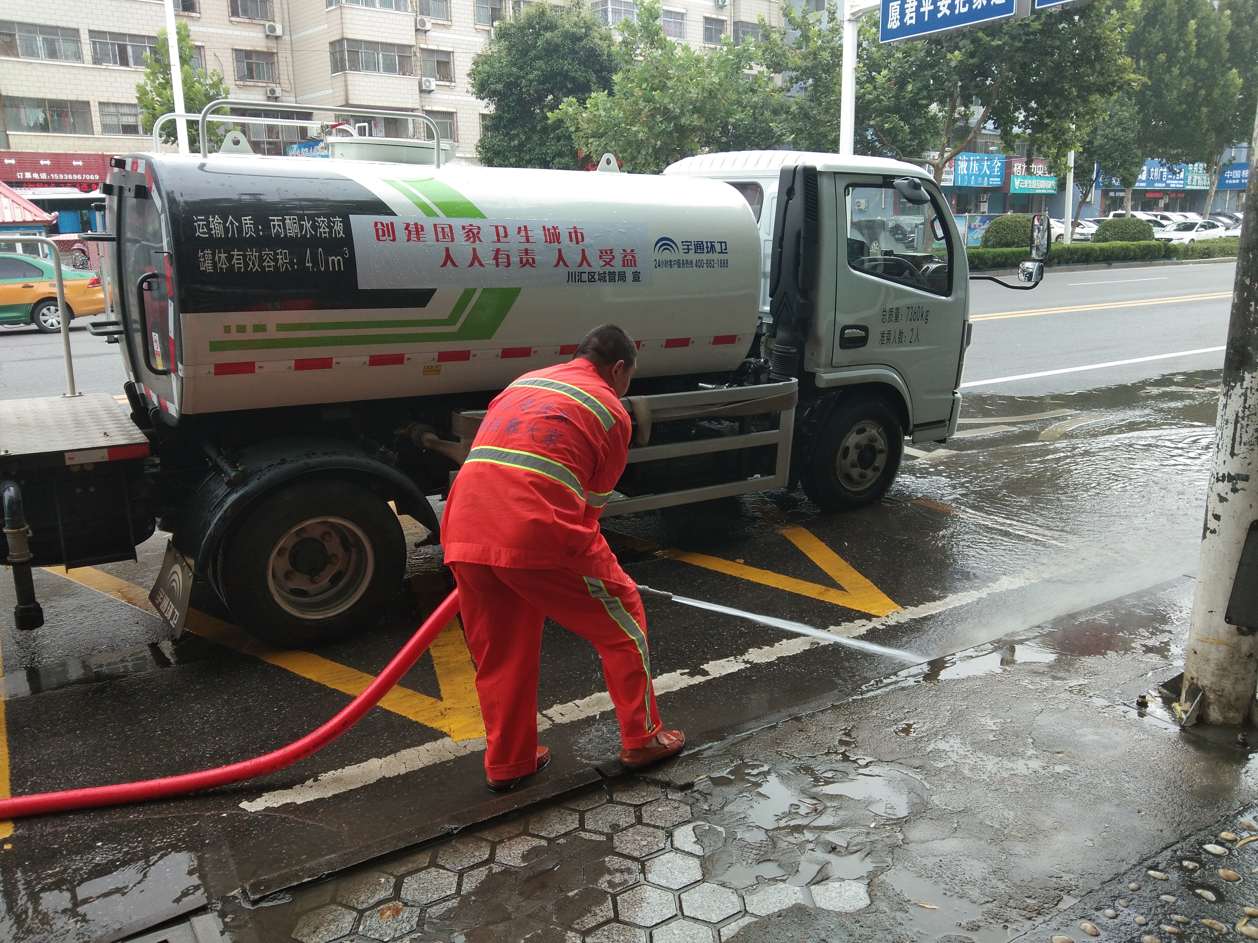 10月4日晚11時許,大雨如注,市區(qū)育新街行人稀少,李宗喜在雨中向一位保潔人員示范“洗路”,身上的衣服已經濕透。