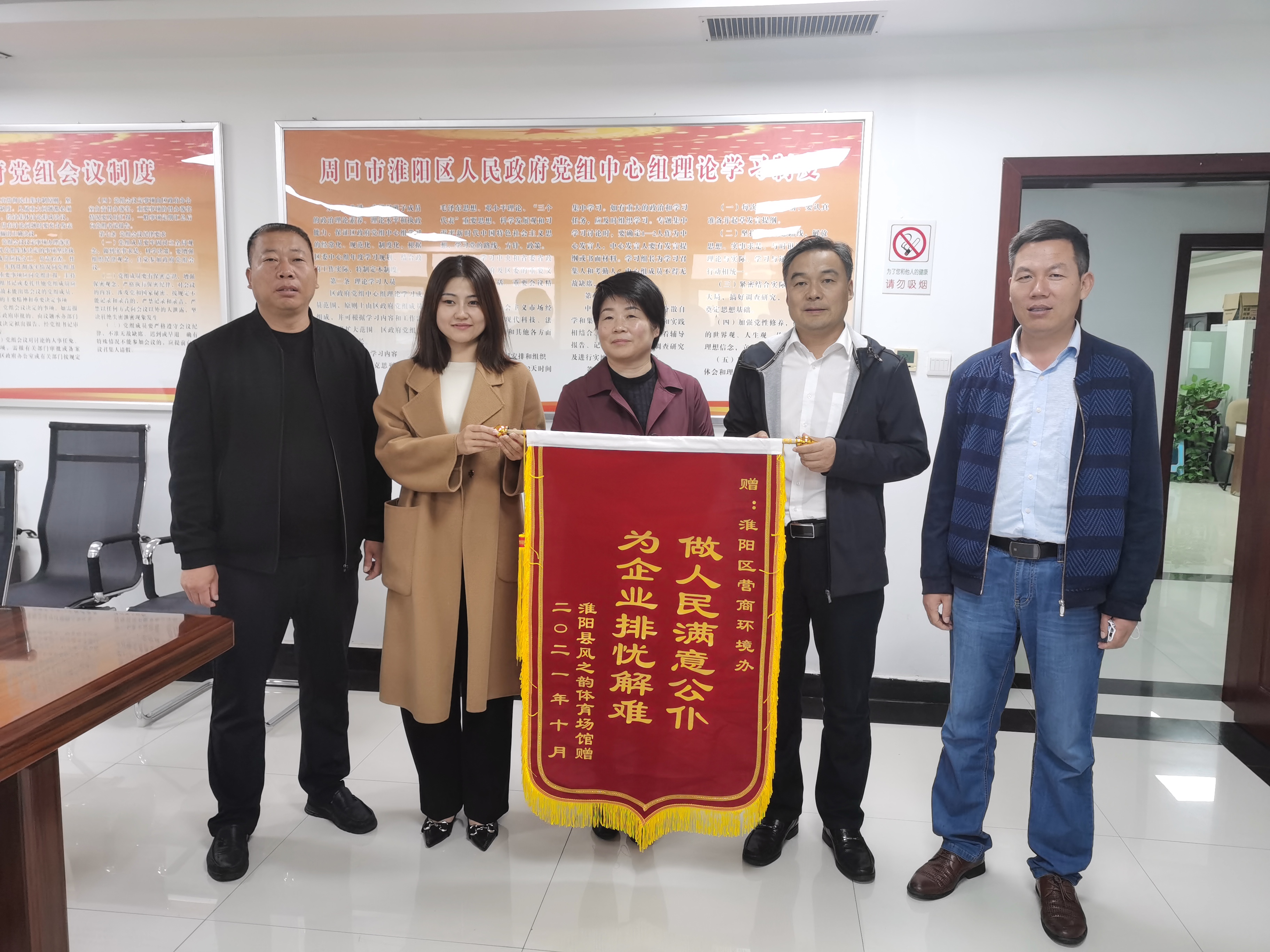 10月8日下午,淮陽(yáng)區(qū)風(fēng)之韻體育館負(fù)責(zé)人把一面印著“做人民滿意公仆 為企業(yè)排憂解難”的錦旗送到淮陽(yáng)區(qū)優(yōu)化營(yíng)商環(huán)境辦公室,對(duì)區(qū)營(yíng)商辦協(xié)調(diào)職能部門容缺辦理,快速解決企業(yè)痛點(diǎn)難點(diǎn)問(wèn)題表示感謝。