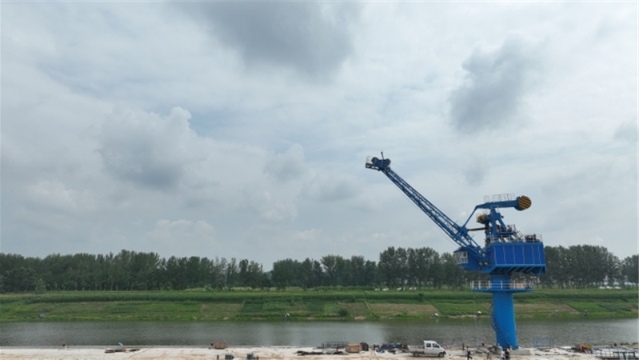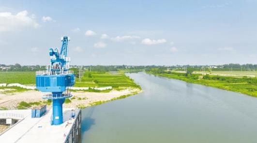 • 盛夏七月,在項(xiàng)城市東部的項(xiàng)城港,幾架“高聳入云”的新式固定式起重機(jī)的主體已安裝完畢,剩余的部件堆放在地上,巨大的框架和鮮紅的涂裝展示著它們的力量。一側(cè),千噸級(jí)貨輪正??吭陂L長的泊位前,起重機(jī)緩緩卸下貨艙內(nèi)的散貨。