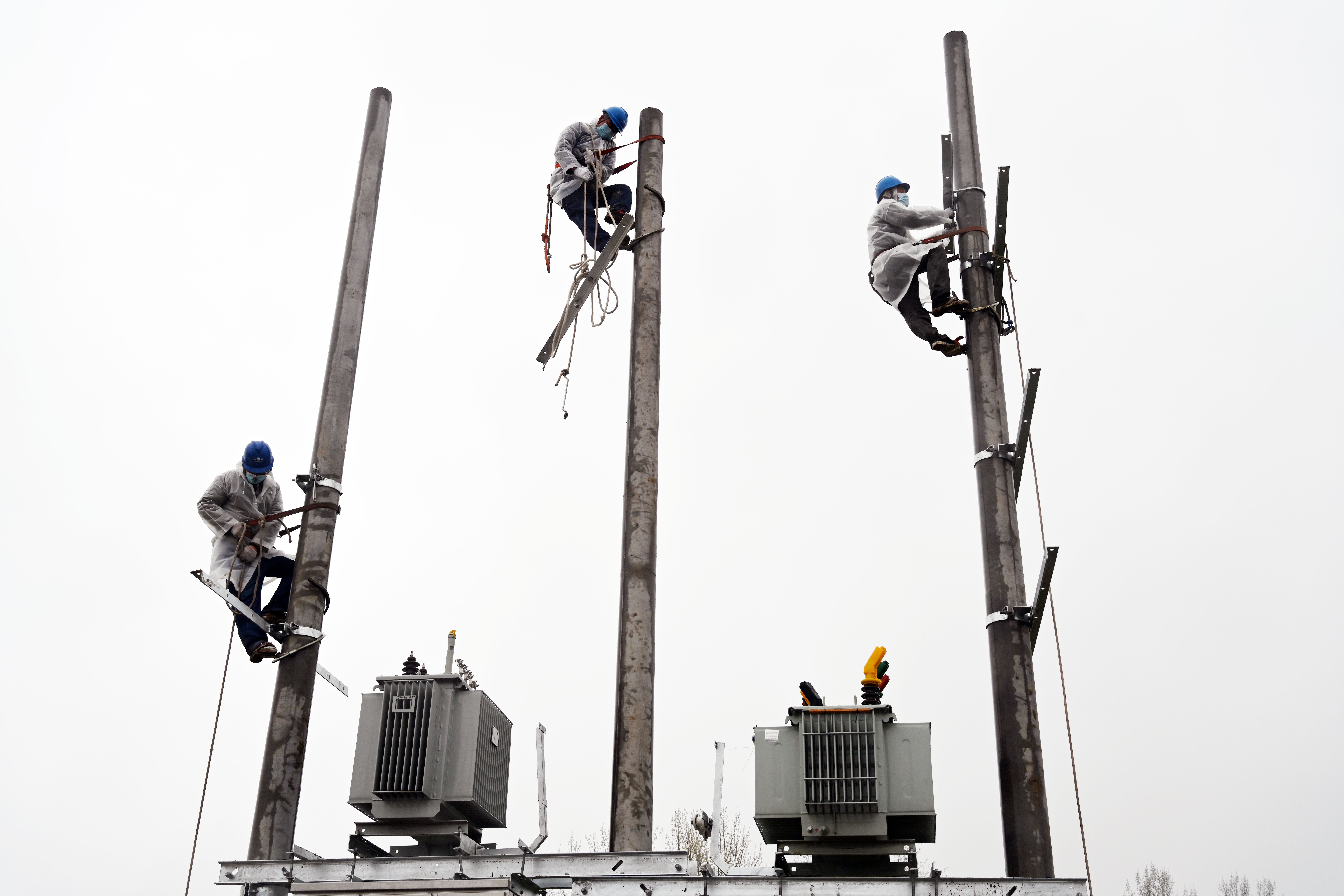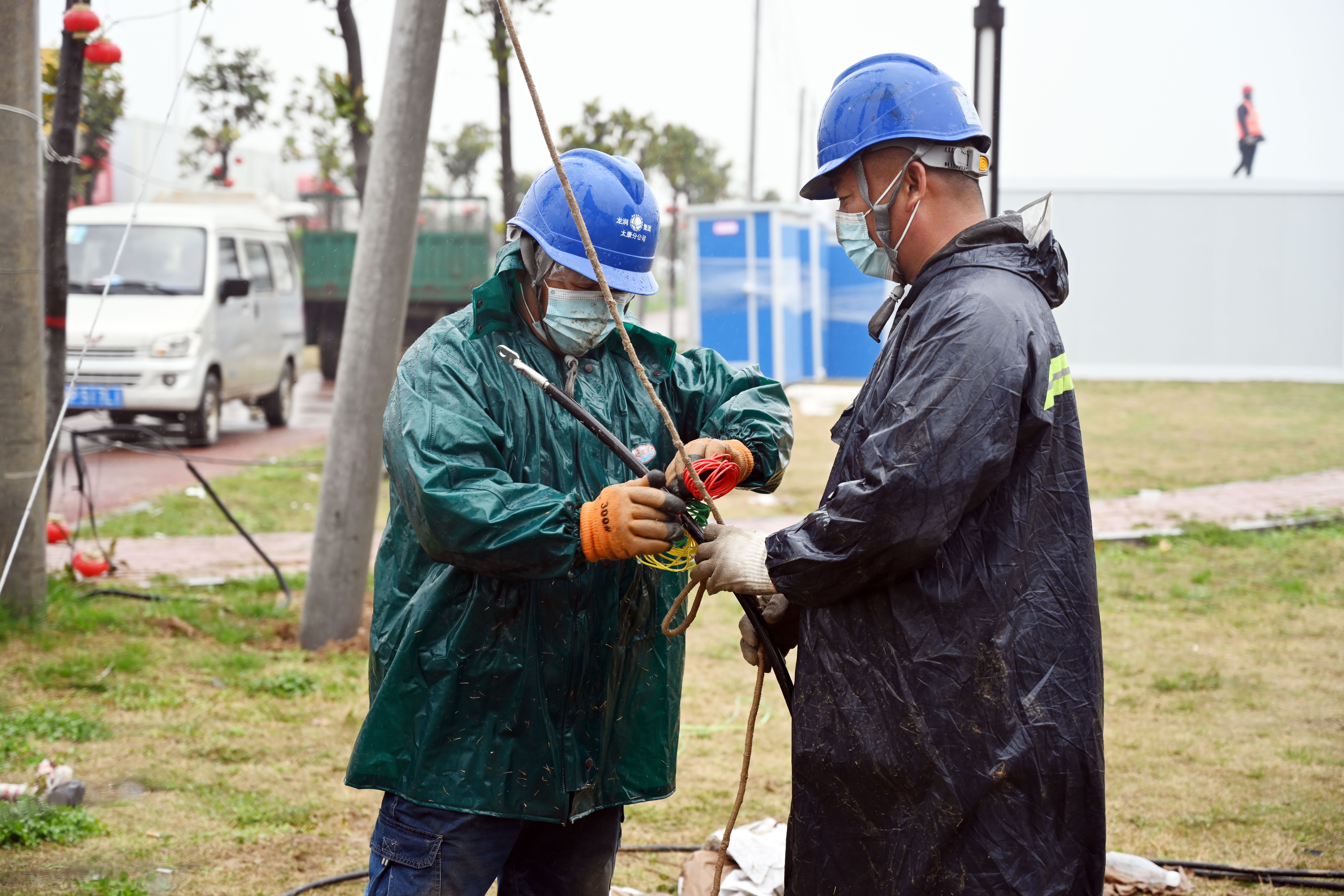 3月25日,在太康縣北環(huán)路核酸檢測方艙和隔離方艙建設(shè)現(xiàn)場,國網(wǎng)太康縣供電公司工作人員正冒雨施工為其提供電力保障。