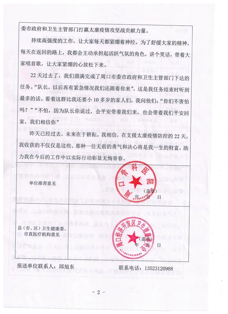勤付出的一種表彰。作為醫(yī)療隊(duì)長(zhǎng),我深知,不僅個(gè)人要把工作干好,更重要的是在保障好大家安全的前提下,組織大家發(fā)揮最大的團(tuán)隊(duì)力量,為周口市委、市政府和衛(wèi)生主管部門打贏太康疫情攻堅(jiān)戰(zhàn)貢獻(xiàn)力量。