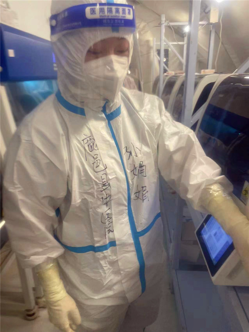 3月18日,孫娟娟及同事進(jìn)駐了長(zhǎng)春疫情最嚴(yán)重的九臺(tái)區(qū),隨行的還有方艙實(shí)驗(yàn)室。次日,孫娟娟和同事們進(jìn)行了防護(hù)培訓(xùn),隨即開始核酸檢測(cè)實(shí)驗(yàn)。孫娟娟穿著密不透風(fēng)的防護(hù)服,身心各種莫名的滋味都涌上來(lái)了。當(dāng)她想到這每一個(gè)標(biāo)本后面是一雙雙期盼的眼睛、一個(gè)個(gè)焦慮的家庭,她不禁為自己打氣——加油!我們就是這場(chǎng)疫情的偵察兵,要把偵察到的情報(bào)準(zhǔn)確無(wú)誤地傳遞過去。