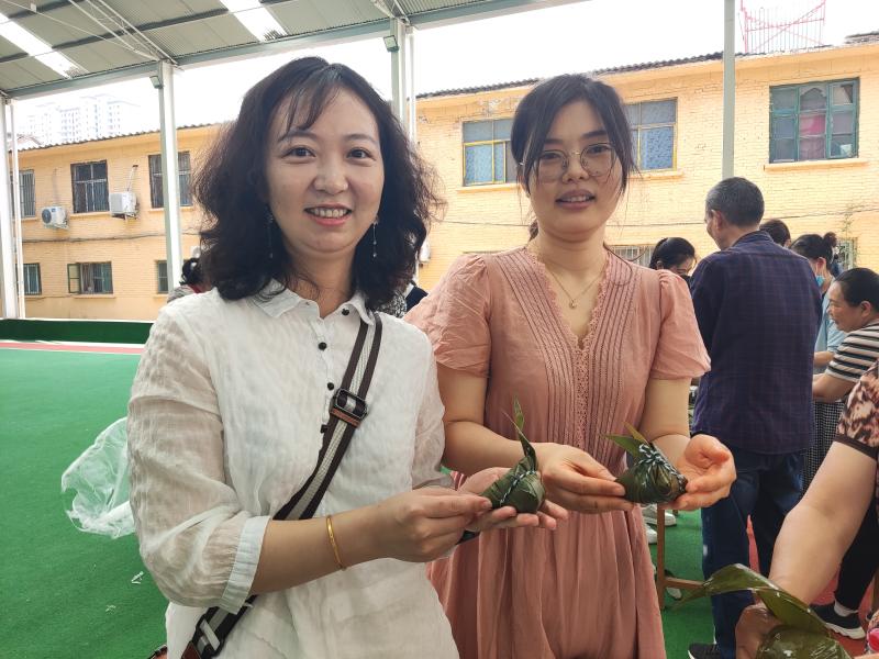 “雖然我平常很少包粽子,但還是挺簡單的?!蔽乃蓮?qiáng)邊說邊包,用繩子將粽子纏繞好,用牙咬住繩子的一頭,一手拿粽子,另一手將繩子打結(jié)。整個(gè)過程一氣呵成,引來不少人前來學(xué)習(xí)。