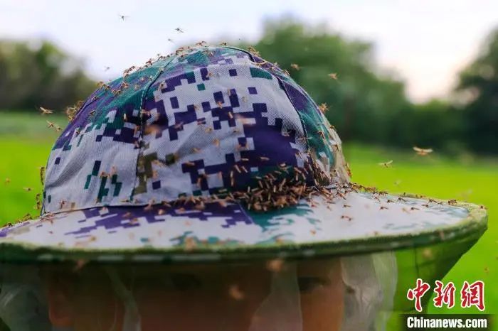 資料圖:防蚊帽上落滿了蚊蟲。徐明遠 攝
