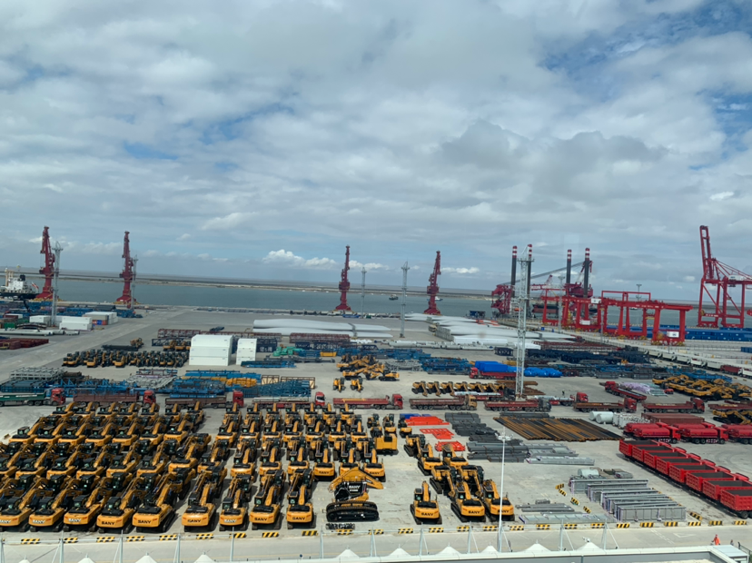 由于疫情防控的原因,記者沒能進(jìn)入港口核心區(qū),只能站在港口辦公大樓樓頂遠(yuǎn)眺港口。站在樓頂,港口景觀盡收眼底——挖掘機(jī)和風(fēng)機(jī)葉片被“碼”的整整齊齊,正待裝船出口;機(jī)器不停運(yùn)轉(zhuǎn),給停靠的船只裝卸貨物;重型貨柜車進(jìn)出有序、川流不息。而令人驚奇的是,諾大的港口空無一人。