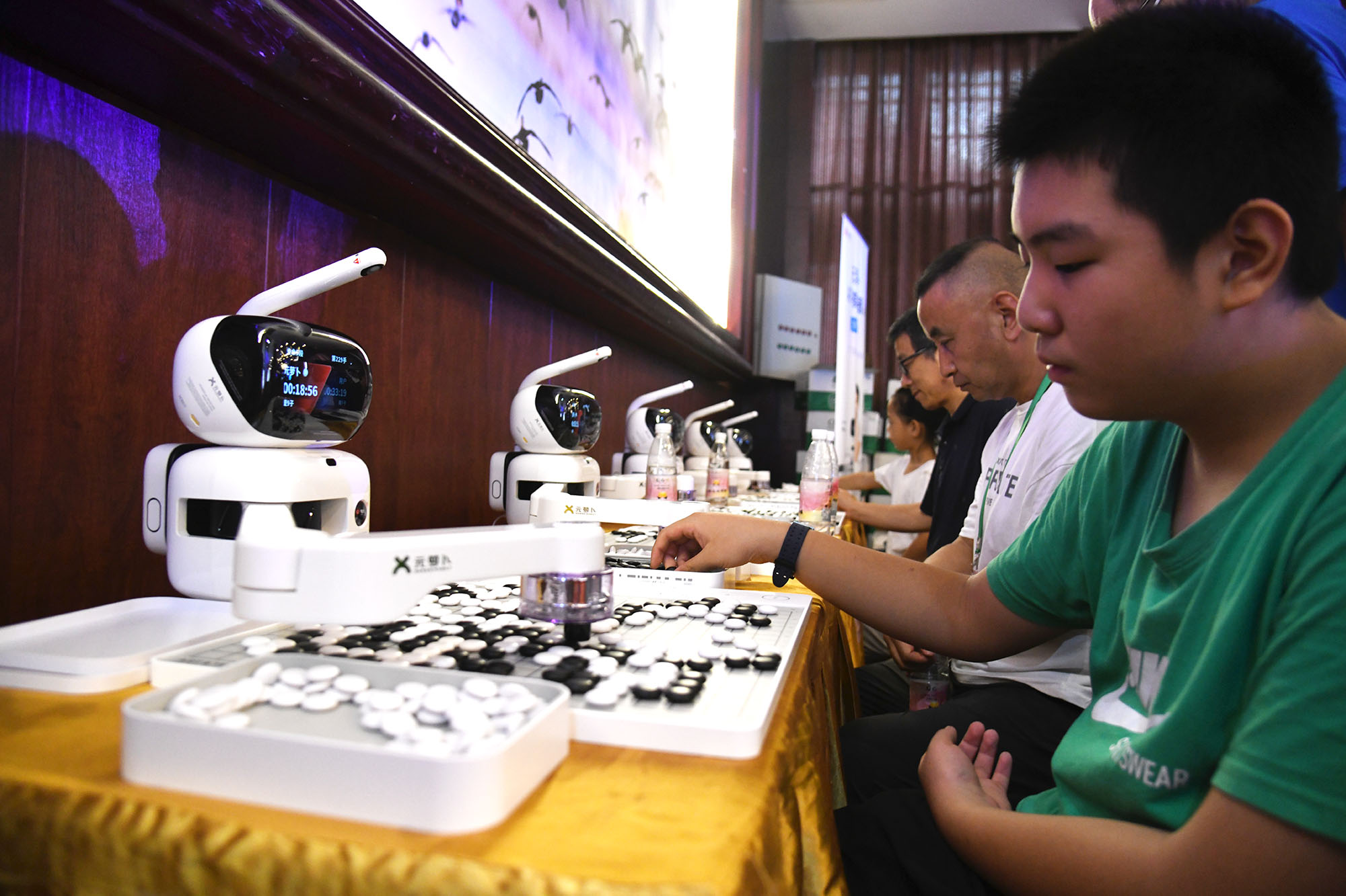 ?8月15日上午,圍棋棋手們?cè)谫愂麻g隙,和機(jī)器人對(duì)弈,增添不少樂趣。在2023中國淮陽第二屆“荷花杯”全國業(yè)余圍棋公開賽的賽場邊,賽事方特意擺放五部圍棋機(jī)器人,供棋手們?cè)谫愂轮鄪蕵贰9ぷ魅藛T介紹,這些圍棋機(jī)器人很強(qiáng)大,不上網(wǎng)聯(lián)機(jī)的情況下,它們具有業(yè)余圍棋三段水平,如果上網(wǎng)聯(lián)機(jī),則具有職業(yè)九段能力,人機(jī)大戰(zhàn),棋手們未必能贏了機(jī)器人。