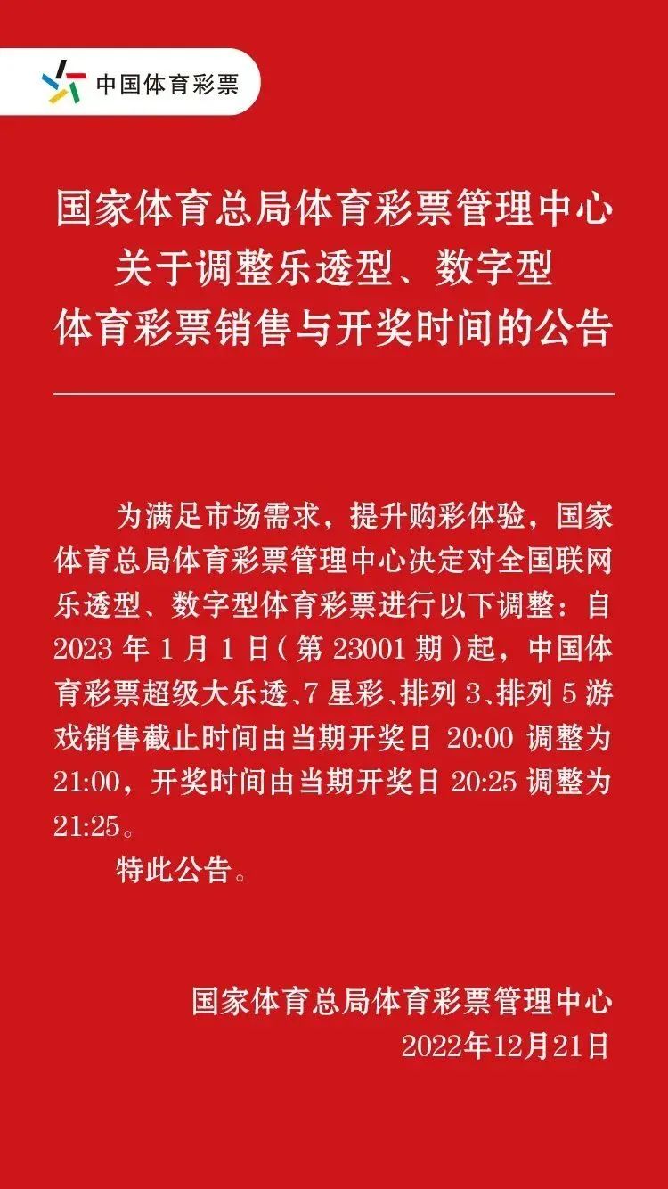2023年1月1日(第23001期)起,體彩超級(jí)大樂(lè)透、7星彩、排列3、排列5游戲的銷(xiāo)售截止時(shí)間將延后至每晚21:00,開(kāi)獎(jiǎng)時(shí)間將延后至不同游戲相應(yīng)開(kāi)獎(jiǎng)日當(dāng)晚21:25。體彩上述四款游戲止售、開(kāi)獎(jiǎng)延后一小時(shí),將為購(gòu)彩者帶來(lái)更加便利的購(gòu)彩體驗(yàn)。