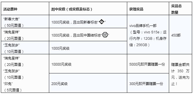 活動期間,購彩者在我省任一體彩銷售實體店購買指定活動票種,若單張彩票刮中符合獎勵條件的獎級(或獎級及標(biāo)志),經(jīng)實體店終端兌獎設(shè)備(IVT或BCR)成功完成獎金兌付及促銷兌獎掃描后,另可獲贈相應(yīng)的獎品。獎品數(shù)量有限,送完為止,詳見下表: