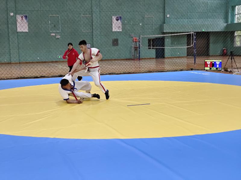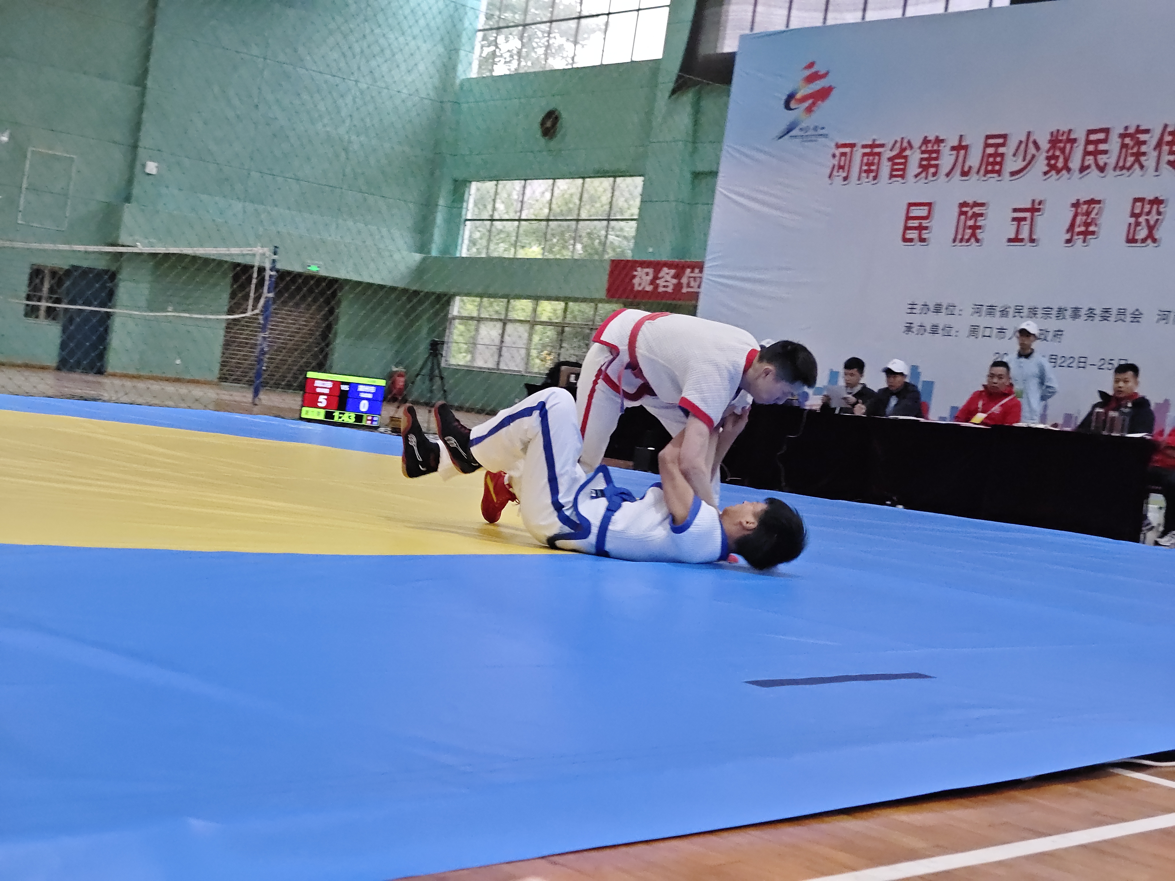 當(dāng)日,河南省第九屆少數(shù)民族傳統(tǒng)體育運(yùn)動(dòng)會(huì)民族式摔跤競(jìng)賽項(xiàng)目在周口師范學(xué)院老體育館開賽。絆跤是首個(gè)登場(chǎng)的跤種,9支代表隊(duì)參賽。該跤種以體重級(jí)別分組進(jìn)行雙敗淘汰賽,共有52kg、62kg、74kg、87kg和87kg以上等5個(gè)公斤級(jí),對(duì)應(yīng)5個(gè)一等獎(jiǎng)。經(jīng)過激烈角逐,來(lái)自漯河市、周口市和河南大學(xué)代表隊(duì)的5名選手獲得一等獎(jiǎng),我市選手李祥楷、劉小濤分別獲62kg、87kg一等獎(jiǎng)。