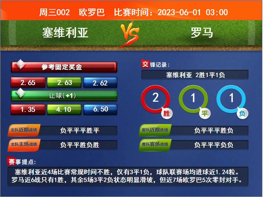 比賽時間:2023-06-01 03:00賽事提點:塞維利亞近4場比賽常規(guī)時間不勝,僅有3平1負,球隊聯賽場均進球近1.24粒。羅馬近6戰(zhàn)只有1勝,其余5場3平2負狀態(tài)明顯滑坡,但近7場歐羅巴5次零封對手。