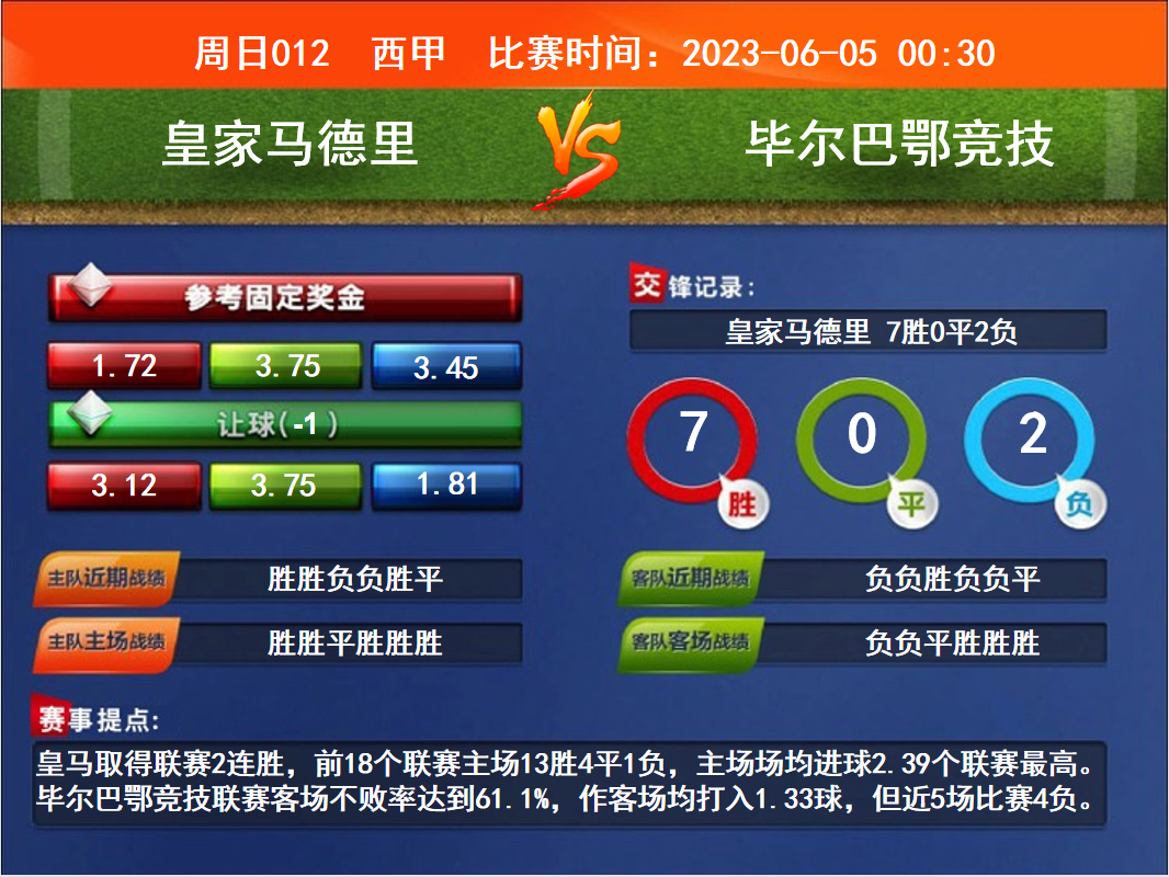 比賽時間:2023-06-05 00:30賽事提點:皇馬取得聯(lián)賽2連勝,前18個聯(lián)賽主場13勝4平1負,主場場均進球2.39個聯(lián)賽最高。畢爾巴鄂競技聯(lián)賽客場不敗率達到61.1%,作客場均打入1.33球,但近5場比賽4負。