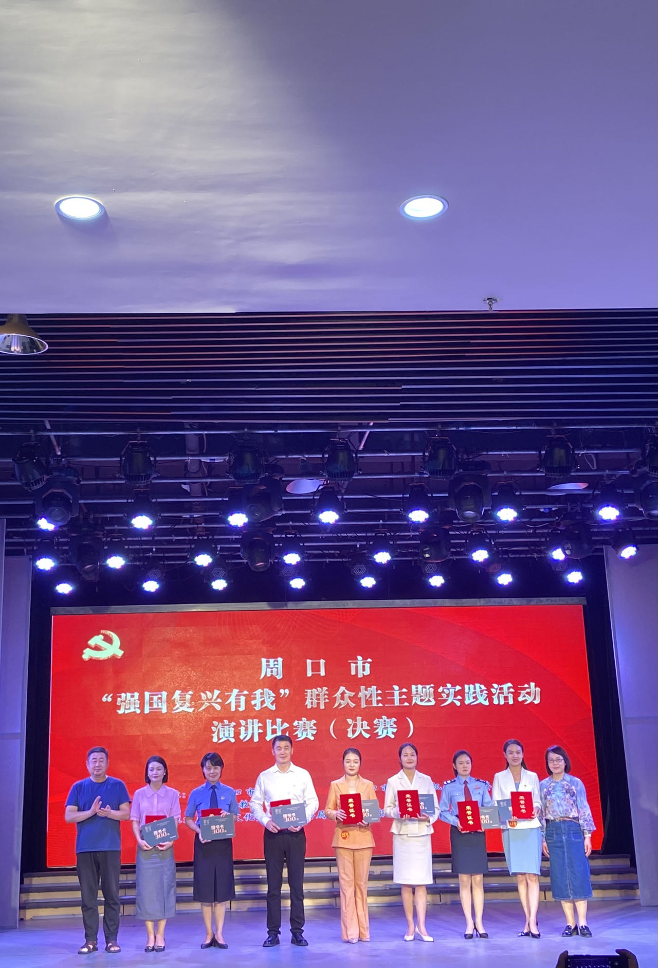 決賽過程中,選手立足中國式現(xiàn)代化全面推進中華民族偉大復(fù)興的廣闊征程, 以各自學(xué)習(xí)、工作、生活為視角,以微故事、微黨課、微講述為主要方式,用飽滿的熱情講述了學(xué)習(xí)宣傳貫徹黨的二十大精神的個人感悟、具體實踐;講述了錨定“兩個確保”,實施 “ 十大戰(zhàn)略”,推進中國式現(xiàn)代化周口實踐的實際行動;講述了繁榮發(fā)展文化事業(yè),深入實施文旅文創(chuàng)融合戰(zhàn)略周口實踐之“我”的認識。選手們情感充沛、慷慨激昂,“強國有我 請黨放心”的口號鏗鏘有力,響徹劇場,展示了一代周口青年奮力譜寫中國式現(xiàn)代化周口絢麗篇章的信心和決心。