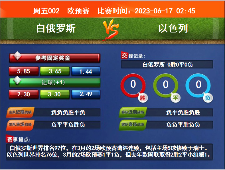 比賽時間:2023-06-17 02:45賽事提點:白俄羅斯世界排名97位,在3月的2場歐預賽遭遇連敗,包括主場5球慘敗于瑞士。以色列世界排名76位,3月的2場歐預賽1平1負,但去年歐國聯(lián)取得2勝2平小組第1。