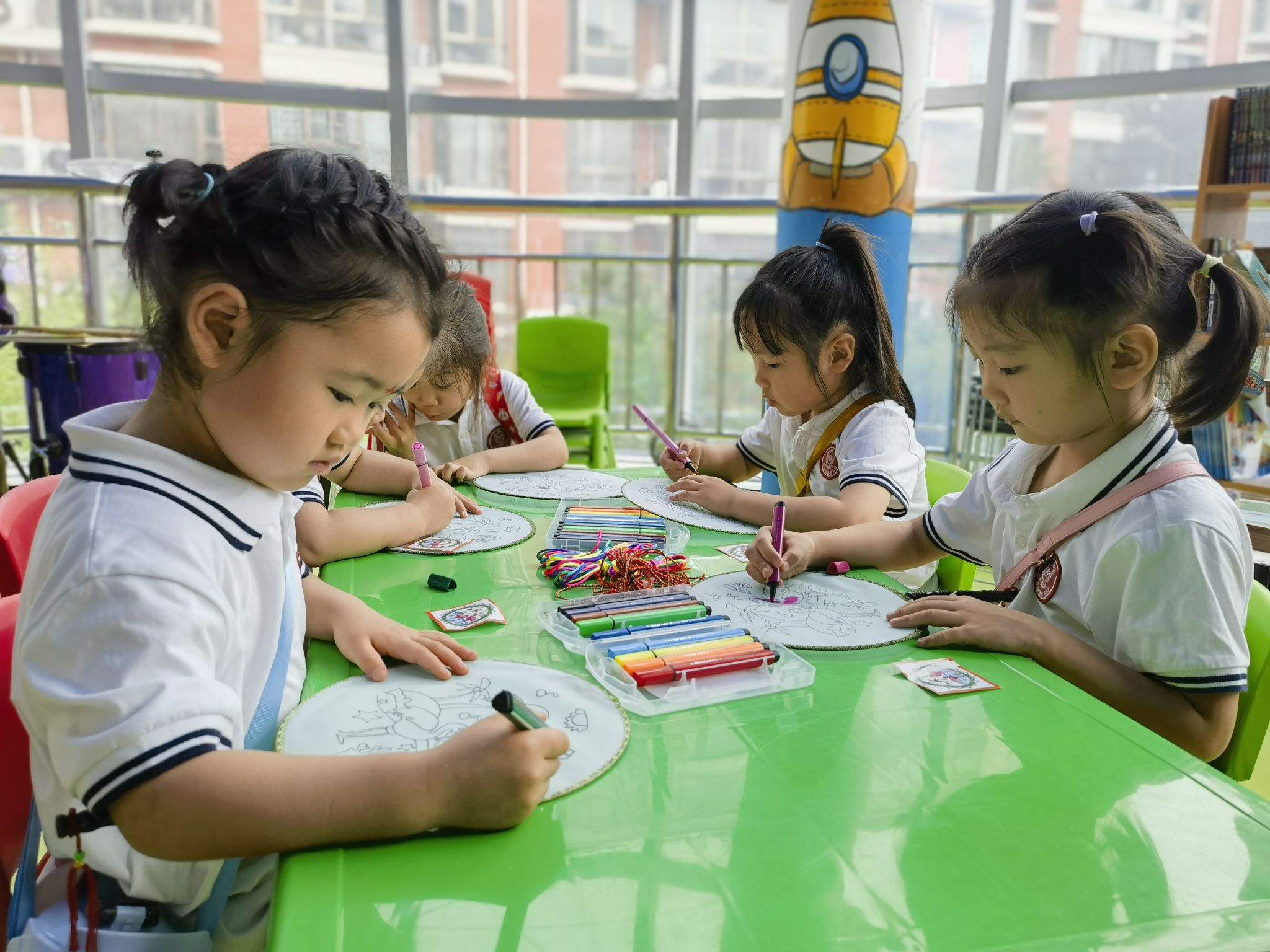 編織五彩繩是端午節(jié)的習(xí)俗之一,有祈福納吉的美好寓意;團(tuán)扇是古代扇文化的代表,有著深厚的文化底蘊(yùn)……在當(dāng)天的活動(dòng)中,中原社區(qū)還邀請(qǐng)部分小朋友參與畫團(tuán)扇、編彩繩活動(dòng)。道德文明使者給小朋友們分發(fā)了空白團(tuán)扇、顏料等,耐心地講解繪畫方法及團(tuán)扇的歷史。聽著講解,小朋友們一筆一畫在潔白的扇面上描繪出一個(gè)個(gè)色彩鮮艷的形象,一把把素面團(tuán)扇被賦予了栩栩如生的圖景,讓大家感受到了傳統(tǒng)文化的魅力。隨后,道德文明使者拿起五彩絲線,手把手教小朋友們編彩繩,讓他們感受手工藝的樂(lè)趣?!敖裉斓幕顒?dòng)非常有意義,我喜歡編彩繩,也喜歡畫畫?!毙∨笥褬?lè)樂(lè)(化名)說(shuō)。