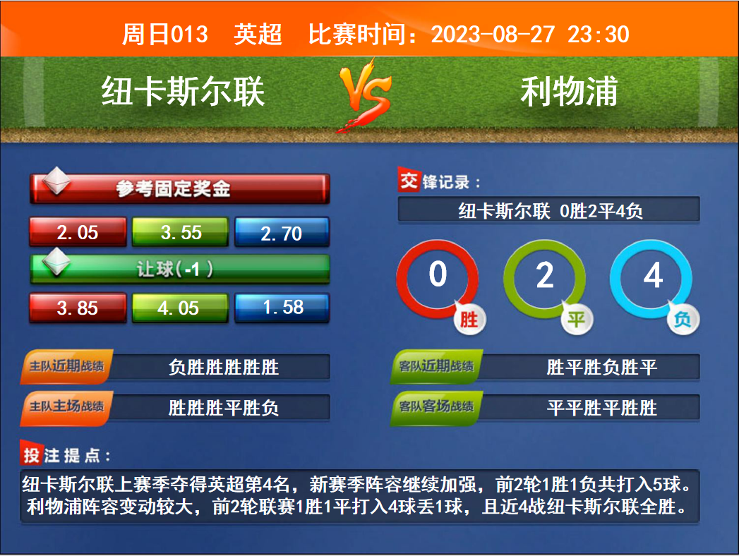 比賽時間:2023-08-27 23:30賽事提點:紐卡斯?fàn)柭?lián)上賽季奪得英超第4名,新賽季陣容繼續(xù)加強,前2輪1勝1負共打入5球。利物浦陣容變動較大,前2輪聯(lián)賽1勝1平打入4球丟1球,且近4戰(zhàn)紐卡斯?fàn)柭?lián)全勝。