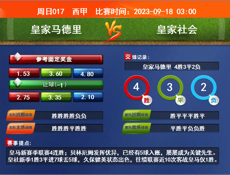 比賽時間:2023-09-18 03:00賽事提點:皇馬新賽季聯(lián)賽4連勝;貝林厄姆發(fā)揮優(yōu)異,已經(jīng)有5球入賬,屢屢成為關(guān)鍵先生。皇社新季1勝3平進7球丟5球,久保健英狀態(tài)出色,往績聯(lián)賽近10次客戰(zhàn)皇馬僅1勝。