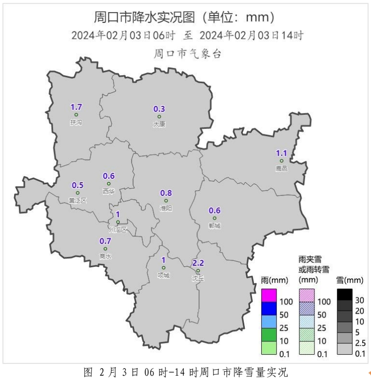 過程累計雨雪量:1月31日14時﹣2月3日14時,最大雨雪量出現(xiàn)在扶溝17.4 毫米。各國家站累計雨雪量(毫米):扶溝17.4、沈丘16.8、川匯區(qū)15.3、商水14.1、項城13.3、鄲城13.1、西華12.7、太康12.6、淮陽12.3、鹿邑10.5、黃泛區(qū)10.0。