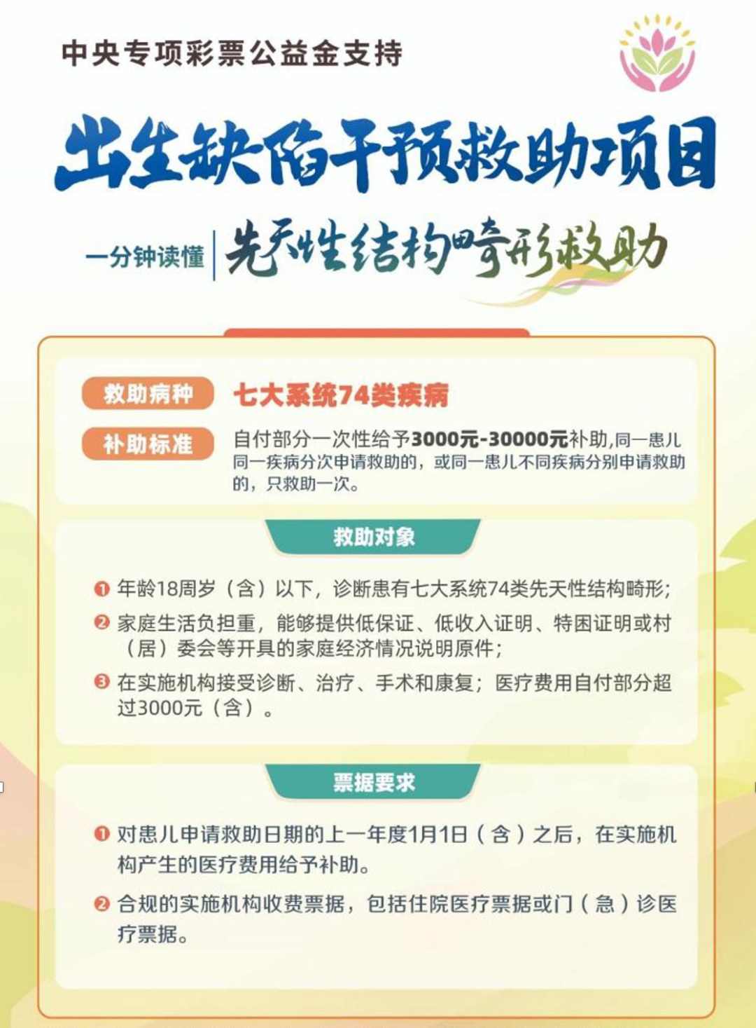 中央專項彩票公益金支持出生缺陷救助項目,旨在向患有遺傳代謝病、先天性結(jié)構(gòu)畸形和功能性出生缺陷等三類出生缺陷疾病的經(jīng)濟(jì)困難家庭提供醫(yī)療費用補助,減輕患兒家庭醫(yī)療負(fù)擔(dān)。該項目由衛(wèi)生健康委委托中國出生缺陷干預(yù)救助基金會組織實施。