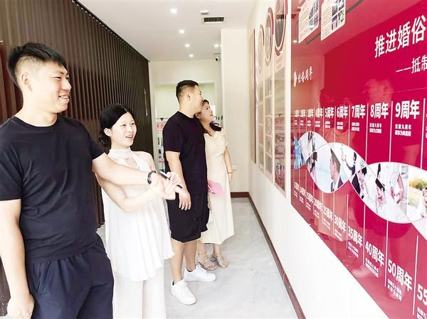 近年來(lái),沈丘縣加大精神文明建設(shè)力度,通過舉辦文化大講堂等活動(dòng),在廣大群眾中形成“天價(jià)彩禮不可取,鋪張浪費(fèi)最可恥,陳規(guī)陋習(xí)危害大”的共識(shí),許多年輕人在耳濡目染中受到熏陶,新事新辦蔚然成風(fēng)。圖為8月29日,農(nóng)歷七月初七,結(jié)婚登記的新人在婚史展板前駐足。