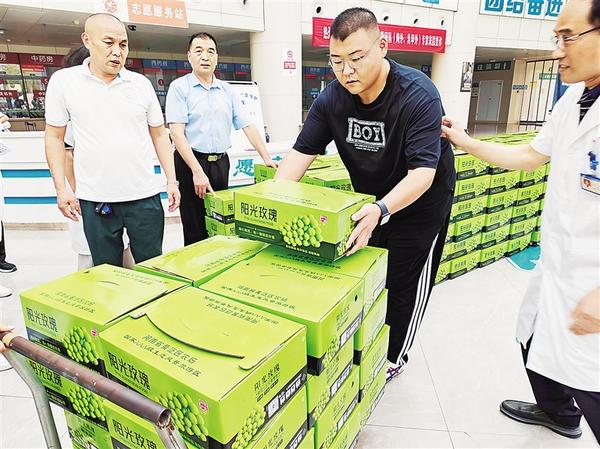 9月7日下午,來自黃泛區(qū)農(nóng)場的時先生(右二)將270箱自家農(nóng)場種植的葡萄捐贈給周口港區(qū)醫(yī)院,與醫(yī)護人員一起分享雙重喜悅:自家果園的豐收和他個人的身體康復。