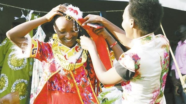 11月10日,學(xué)生在盧旺達(dá)卡永扎試穿中國(guó)服飾?!?a href="http://m.themineralsgroup.com/content/2021-11/13/content_959142.html" target="_blank" >[詳細(xì)]