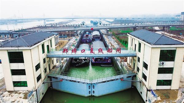 鄭埠口樞紐工程是沙潁河周口段關(guān)鍵性航運(yùn)樞紐工程。近年來,通過航道疏浚、船閘擴(kuò)建等升級改造工程,鄭埠口樞紐通航能力顯著提升,為周口從“黃土經(jīng)濟(jì)”向“藍(lán)海經(jīng)濟(jì)”轉(zhuǎn)型提供了有力支撐。圖為從周口港出發(fā)的貨船等待通過鄭埠口復(fù)線船閘。