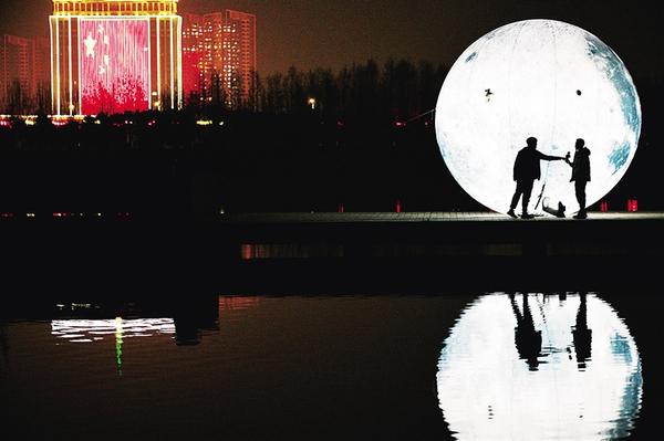 1月18日晚,兩名青年站在引黃調(diào)蓄湖邊的“月亮”前開(kāi)心地唱歌,表達(dá)對(duì)新年的期盼之情。