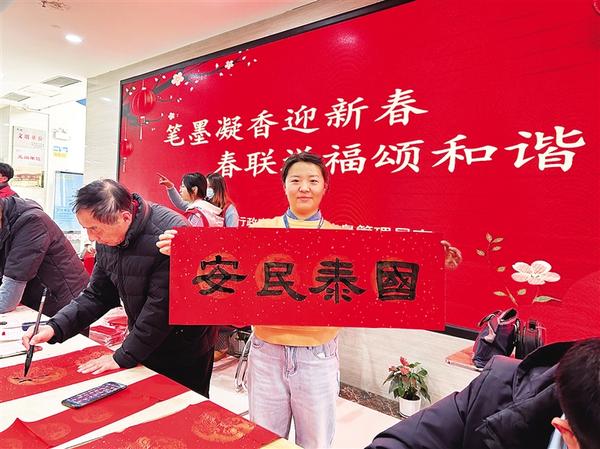 1月20日,扶溝縣政務(wù)服務(wù)中心一名工作人員展示剛收到的手寫春聯(lián)。連日來(lái),我市數(shù)千余名書法家、書法愛(ài)好者為市民寫春聯(lián)、送“福”字,送上美好的祝福。