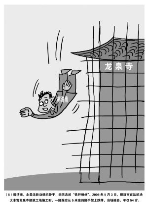 ③ 柳濟(jì)南,北美法輪功組織骨干,李洪志的鐵桿粉絲。2008年5月3日,柳濟(jì)南在法輪功大本營(yíng)龍泉寺建筑工地施工時(shí),一腳踏空從5米高的腳手架上跌落,當(dāng)場(chǎng)斃命,年僅54歲。(漫畫作者 星雨)