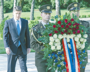 ?、?月9日,在克羅地亞首都薩格勒布,克總理米拉諾維奇(左)在紀(jì)念反法西斯戰(zhàn)爭(zhēng)勝利70周年的活動(dòng)中向人民英雄紀(jì)念碑敬獻(xiàn)花圈。新華社發(fā)