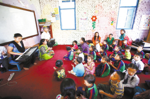 尼泊爾學(xué)校復(fù)課 5月31日,在尼泊爾的巴克塔普爾,復(fù)課的學(xué)生們接受音樂(lè)治療。據(jù)尼泊爾當(dāng)?shù)孛襟w報(bào)道,尼泊爾教育部已經(jīng)宣布,全國(guó)14個(gè)地震受災(zāi)縣的學(xué)校將于5月31日復(fù)課。新華社發(fā)