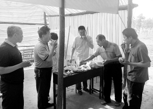 6:30:王隆集行政村黨支部書記趙長(zhǎng)領(lǐng)、包村干部王海強(qiáng)召集其他四位行政村干部在設(shè)在村頭的“三夏”防火指揮部開會(huì)。